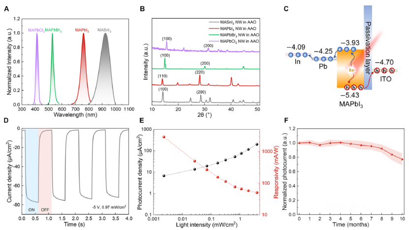 要點:鈣鈦礦納米線是在氧化鋁納米通道內(nèi)以鉛納米線作為前驅(qū)體之一生長的,未完全消耗的鉛與鈣鈦礦形成接觸,在除去基底后,通過熱蒸鍍的方式制備凹球面的銦電極,研究者使用PμSL 3D打印技術(shù)制備了與半球殼凹面共形的掩膜版。氧化鋁多孔結(jié)構(gòu)為鈣鈦礦材料提供了天然的封裝,提高了器件的工作性能。通過調(diào)節(jié)鈣鈦礦中的鹵素和金屬元素,PNA光電探測器感測區(qū)域可以從可見拓展到近紅外。在弱光下,探測器的響應(yīng)度可達到2.9 A/W,隨著光照強度的增加,光電流增加而響應(yīng)度減小。此外,未封裝的器件在常規(guī)環(huán)境中存放 10 個月后,仍保持超過80%的原始光電流數(shù)值。
