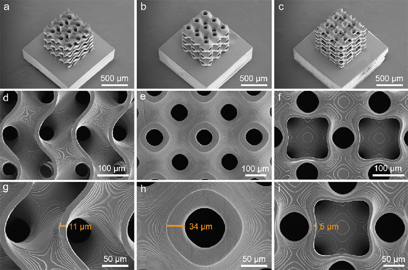 現場展示了采用該聚合物SiOC陶瓷前驅體打印的三重周期極小曲面多孔結構,其打印的總尺寸僅為1× 1× 1 mm,最小壁厚僅為5μm。與已有文獻報道數據對比,由聚合物SiOC陶瓷前驅體打印出的結構在打印精度、比強度、硬度和陶瓷產率等四方面均處于領先水平。