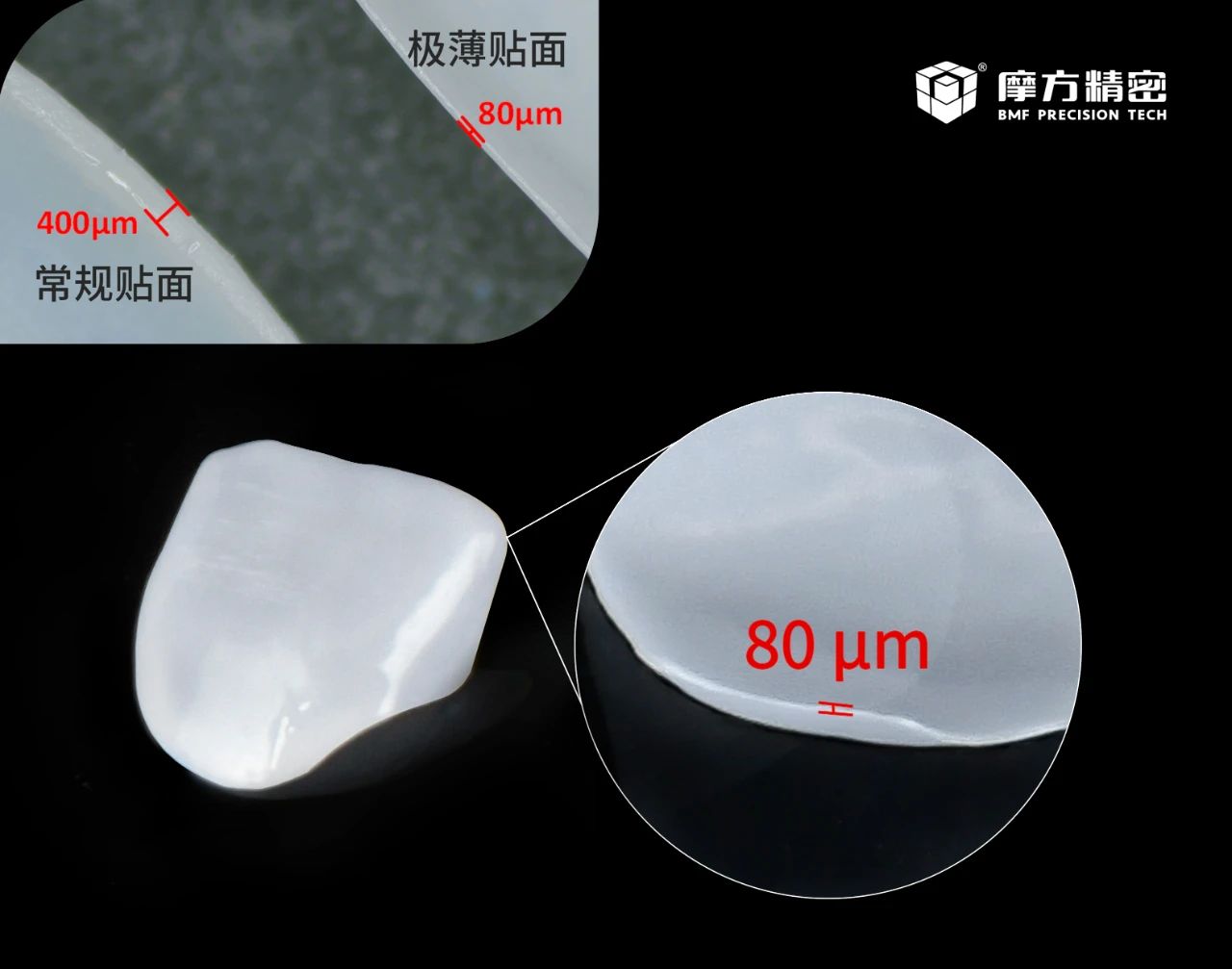 基于超高精度3D打印技術,摩方精密投資Venust皓昕氧化鋯陶瓷貼面品牌,推出目前全球最薄可達到0.08毫米的極薄氧化鋯牙齒貼面,與傳統基于車床加工的瓷貼面相比,降低厚度達70%以上。