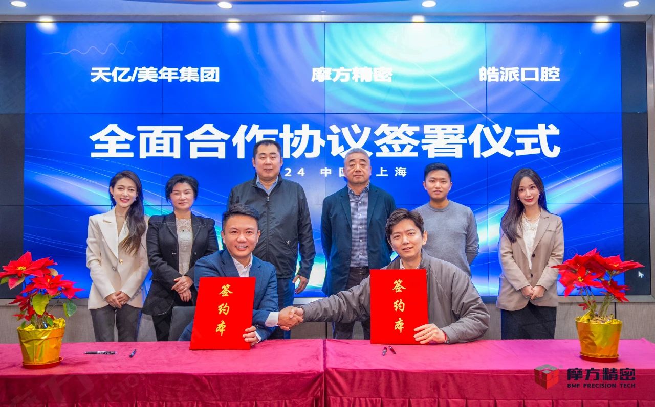 2024年1月21日,摩方精密高級副總裁楊斐、董事會秘書/副總裁祝越,天億集團高級副總裁趙大峰、天億集團副總裁/美年集團董事長特別助理張維、美年集團戰略客戶部總經理楊軍,皓派口腔聯合創始人胡瑞慈、華南區域總經理董傳玉等一行領導,共同參加了簽約儀式。